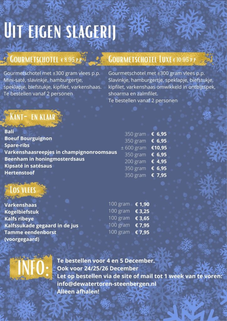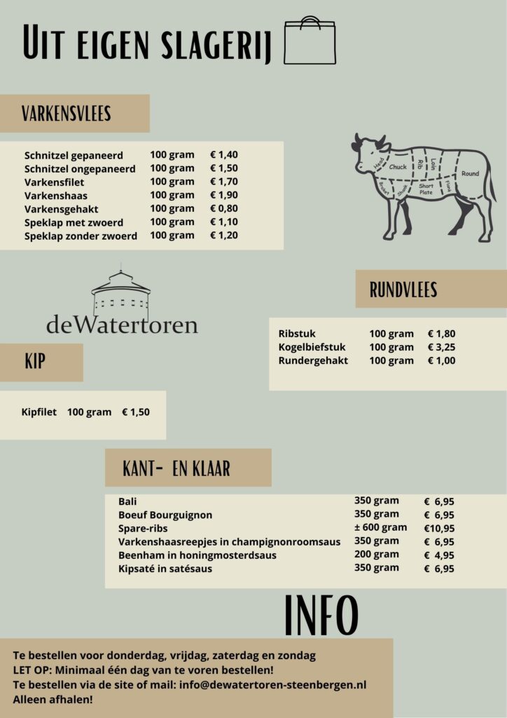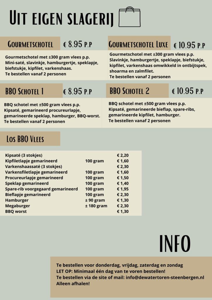 Ook kunt u bij ons op donderdag, vrijdag, zaterdag en zondag vlees, gourmet en dergelijke uit eigen slagerij bestellen. Let op: dit moet u een dag van te voren bestellen! Dit kan via de onderstaande button of via de mail: info@dewatertoren-steenbergen.nl. Let op dat de bevestigingsmail in de spam/ongewenst terecht kan komen.